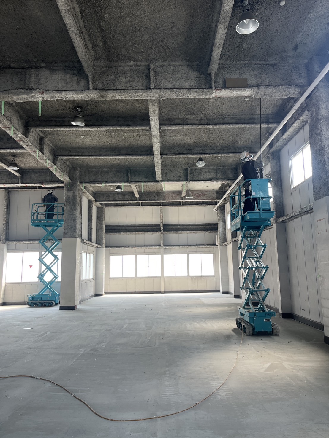 設置場所は天井まで約7メートル。通常の脚立では届かない高さのため、高所作業車を導入しての施工となりました。