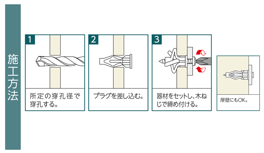 - 3mm厚以上の壁なら、薄壁、厚壁を問わず対応。中空構造壁用プラグの決定版。