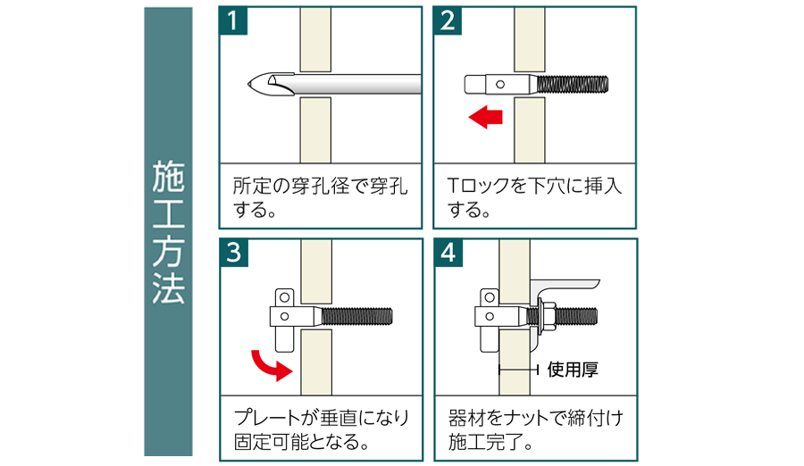 Tロック(TLタイプ)(ユニカ株式会社) アンカー 特徴本体径とプレート幅が同じなので、器材の上から穿孔、アンカー施工が可能TLSタイプはサビに強いオールステンレス製。湿気の多い場所でも幅広く活躍用途中空構造壁押出成形セメント板金具・器具、手摺り等の取付け施工手順(画像URL)注意事項施工時は壁裏の必要中空幅をご確認ください商品購入ページはこちら